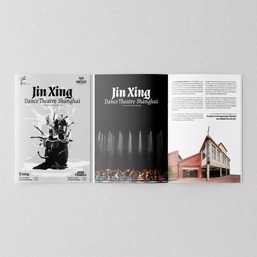 𝗗𝗘𝗦𝗜𝗚𝗡 𝗚𝗥𝗔𝗣𝗛𝗜𝗤𝗨𝗘 : Les affiches de ces deux spectacles ont été imaginées comme un duo complémentaire. Elles dialoguent dans leur composition et incarnent visuellement la puissance émotionnelle des créations chorégraphiques du Jin Xing Dance Theatre. Elles ont ainsi formé un dyptique dans toutes les campagnes d’affichages. Nous avons par ailleurs conçu un livret élégant, distribué au public en salle, présentant les spectacles, les artistes ainsi que l’histoire du Jin Xing Dance Theatre.