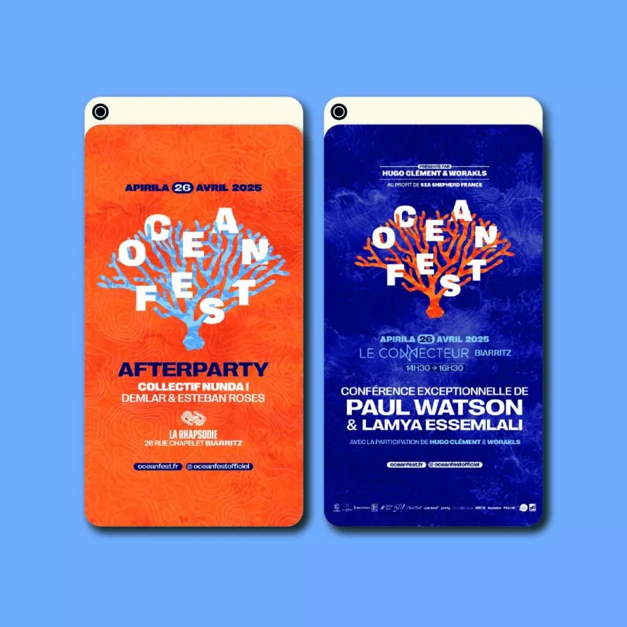 𝗗𝗘𝗦𝗜𝗚𝗡 𝗚𝗥𝗔𝗣𝗛𝗜𝗤𝗨𝗘 : Depuis sa création, les affiches de l’Ocean Fest se répondent à travers leur composition graphique. Notre défi pour cette édition a été de créer une identité dans la continuité de cette collection tout en renouvelant visuellement la communication auprès du public. Nous avons fait le pari de couleurs soutenues et complémentaires pour ce nouveau corail sur fond océanique texturé. Puis, à travers tout un travail de déclinaisons, nous avons mis en lumière les temps forts du weekend — entre concerts, DJ set et conférences — ainsi que les associations soutenues.