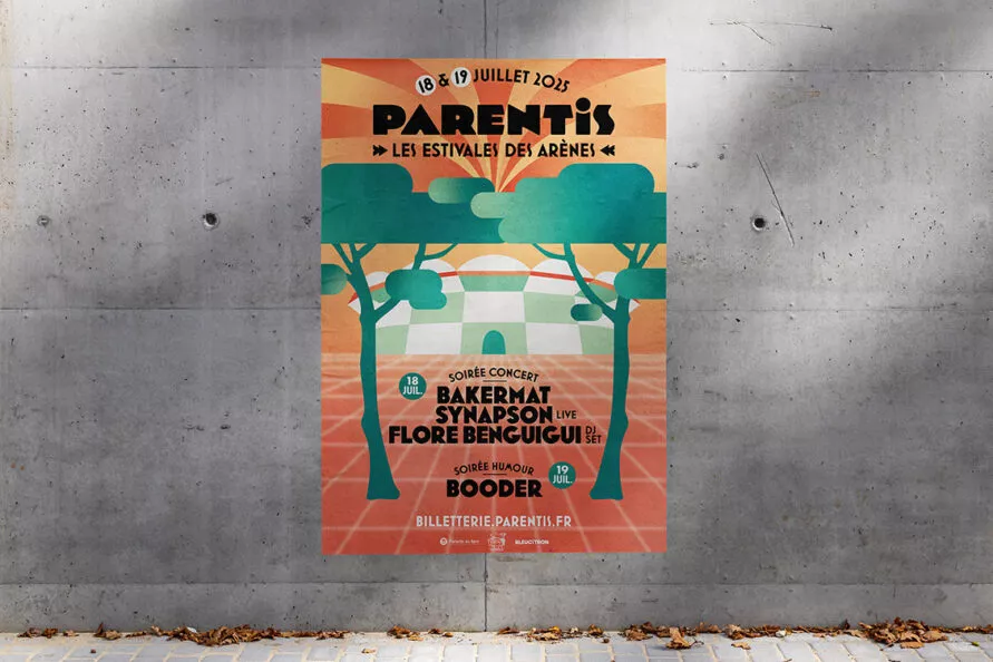 En juillet 2025, la ville de Parentis-en-Born fait naître un nouvel événement au coeur de ses arènes : deux soirées de spectacles entre electro et humour. Nous sommes alors sollicité·es pour la création d’une affiche.