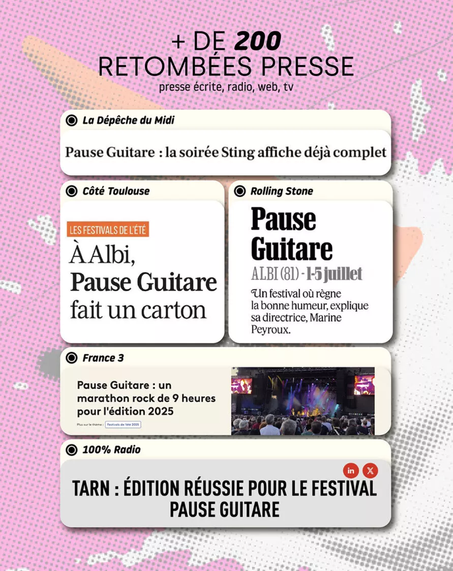 Un accompagnement complet, en amont, pendant et après le festival, pour renforcer la notoriété de Pause Guitare. L’édition 2025 a célébré une édition marquée par le retour d’une scène emblématique au pied de la Cathédrale d’Albi, haut lieu des premières années du festival